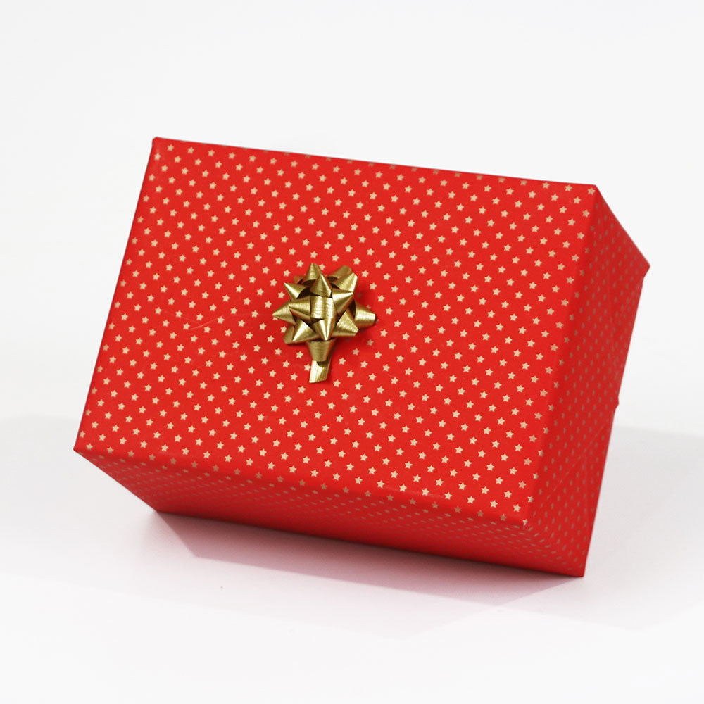 A classy petite design, of gold stars repeating across a bright red background